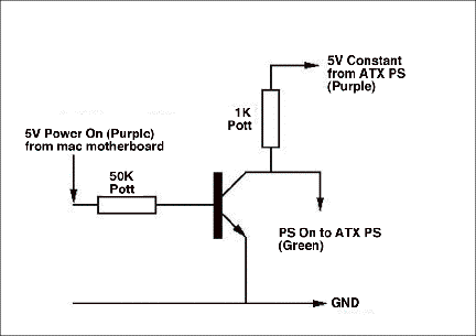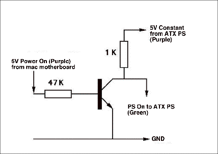A quick and shoddy circuit analysis shows a relatively large resistor on the Mac power-on lead to limit the current output but still allow activation of the transistor and with the PS power-on lead clearly positioned to be connected to ground when the transistor is turned on.