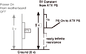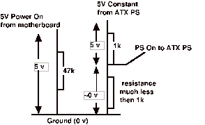 In our circuit we are going to place the transistor such that when the valve is closed the 5V constant and PS power-on leads are separated by a small resistance compared to the almost infinite resistance of the open value and are therefore essentially the same voltage. When the 5v input from the motherboard activates the transistor (opens the valve) the previously small resistance separating the two leads (PS 5v constant and PS power-on) is now very large compared to the small resistance of the open valve and since the voltage from the 5v constant to ground must add up to 5v, and the PS power-on lead is below the 5v constant and has only the very low resistance separating it from ground, the power-on lead gets essentially forced to zero, or near enough to turn on the PS we hope. Since the voltage divides up based on resistance the small resistance gets a smaller percentage of the 5v total than the larger resistance.